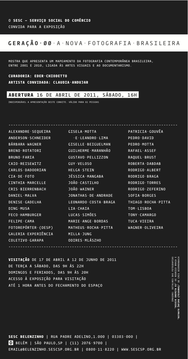 “Olá amigos, envio em anexo o convite de um dos projetos mais importantes que já realizei até hoje e que abrirá no próximo sábado, dia 16, no SESC Belenzinho. A mostra Geração 00: A Nova Fotografia Brasileira reúne cerca de 180 trabalhos de 52 artistas, realizados entre 2001 e 2010.  Geração 00 tem a intenção de demonstrar, por meio de trabalhos ícones da primeira década deste século, como a fotografia brasileira evoluiu de forma original e vigorosa face aos vários questionamentos éticos e estéticos surgidos a partir do impacto das novas tecnologias e da massificação do uso da fotografia, por exemplo. A exposição está dividida em dois espaços e dois segmentos: Limites, Metalinguagem e Documental Imaginário, Novo Fotojornalismo.