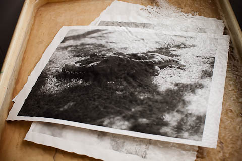 Escolhi uma foto de um jacaré inflável para meu teste inicial. O tempo de exposição ficou em quase 4 minutos com a lente toda aberta (f/8). A luz da cabeça é bem fraca, mas isso é aceitável, já que minha idéia por enquanto é fazer cópias coloridas.