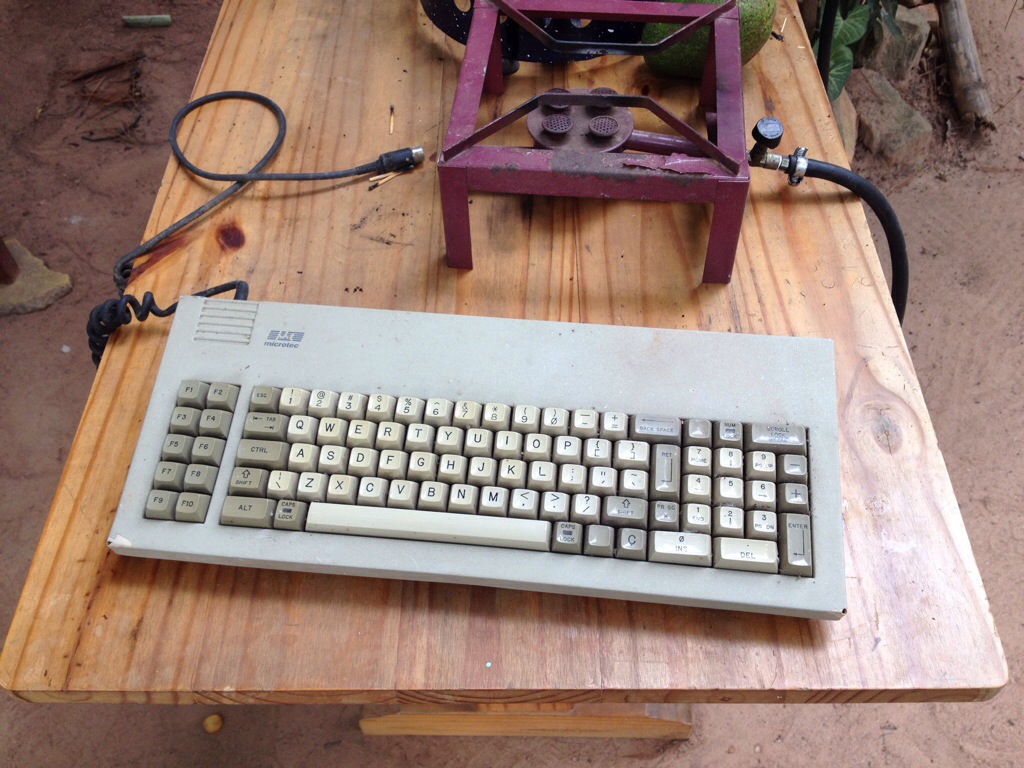 Para ver o que está acontecendo de errado é possível conectar um monitor VGA e um teclado ao PC. Monitor ok, mas teclado AT (anterior ao PS/2) foi um pequeno desafio que vinha se desenrolando há umas duas semanas até que eu mencionei para o Wilson, na festa junina no sítio da Telma. Ela ouviu e me mostrou um teclado que ela tinha guardado.