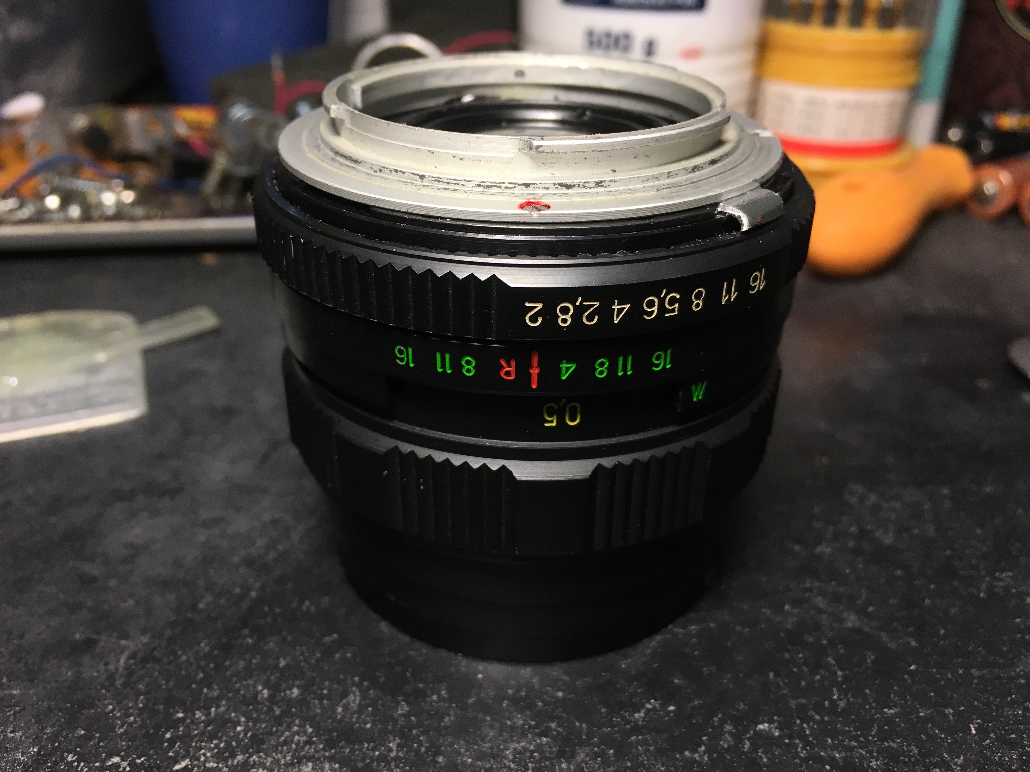 Substitui o anel traseiro dessa Helios. Ainda não pintei. Trabalho meio grosseiro, mas parece que funciona. Aberturas travadas em manual.