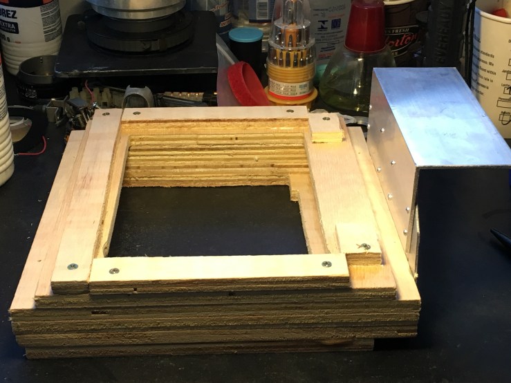 A pior parte foi transportar tudo de volta para o laboratório, mas o espaço estava lá vazio e coube tudo direitinho. Aqui a coluna no lugar, aguardando a montagem final.