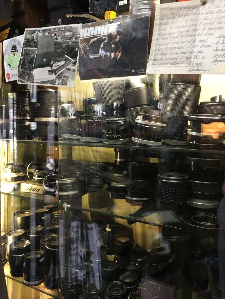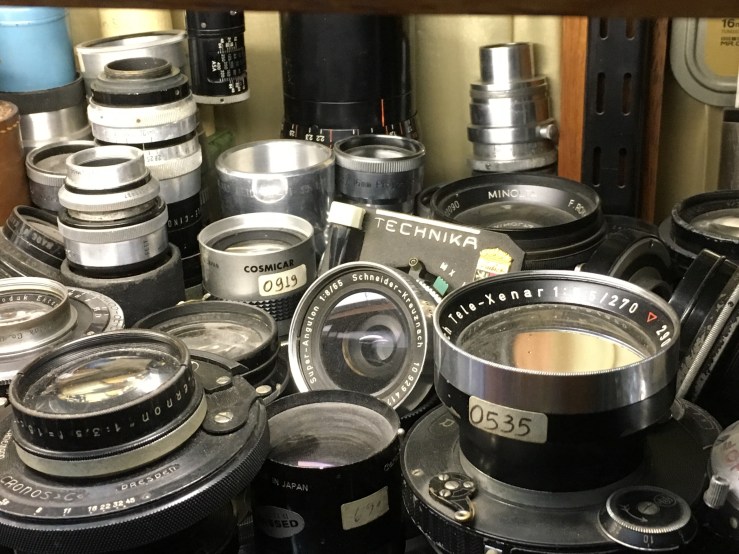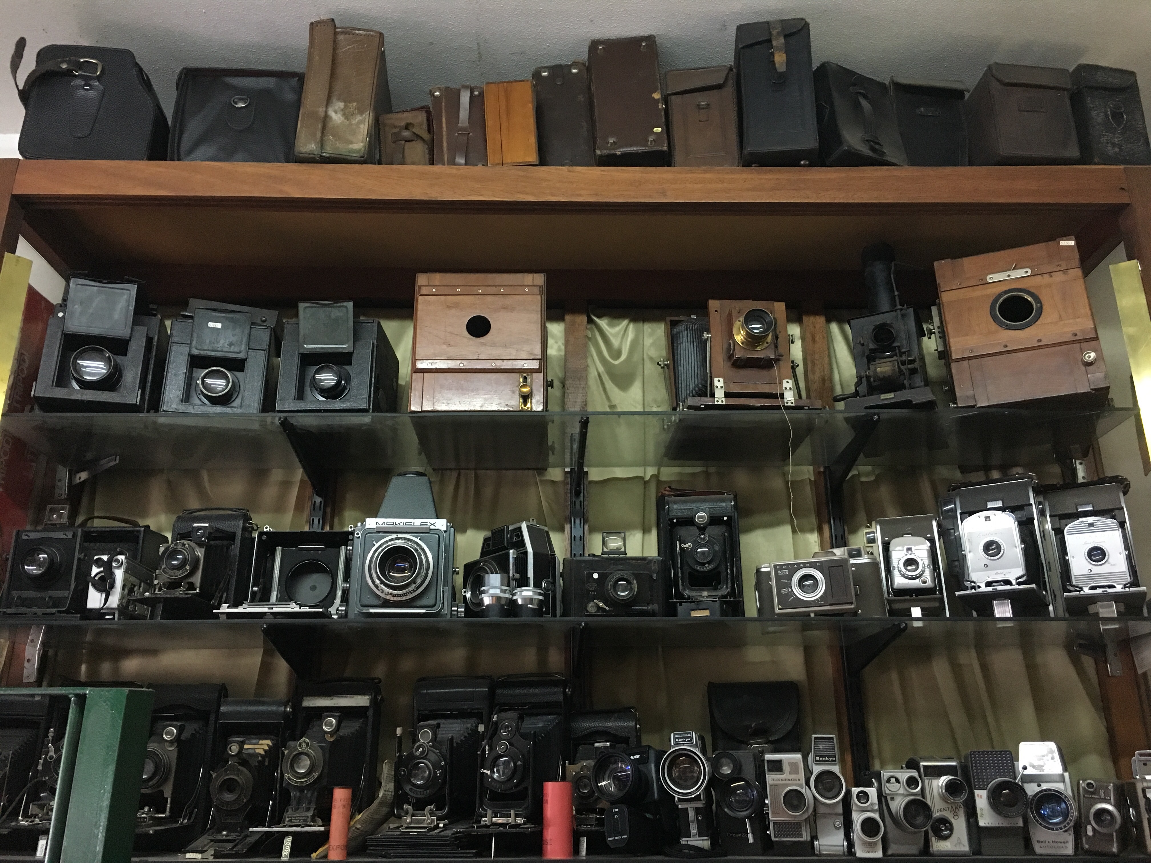 Muita coisa de grande formato espalhada pela loja. Lentes e câmeras bem antigas.