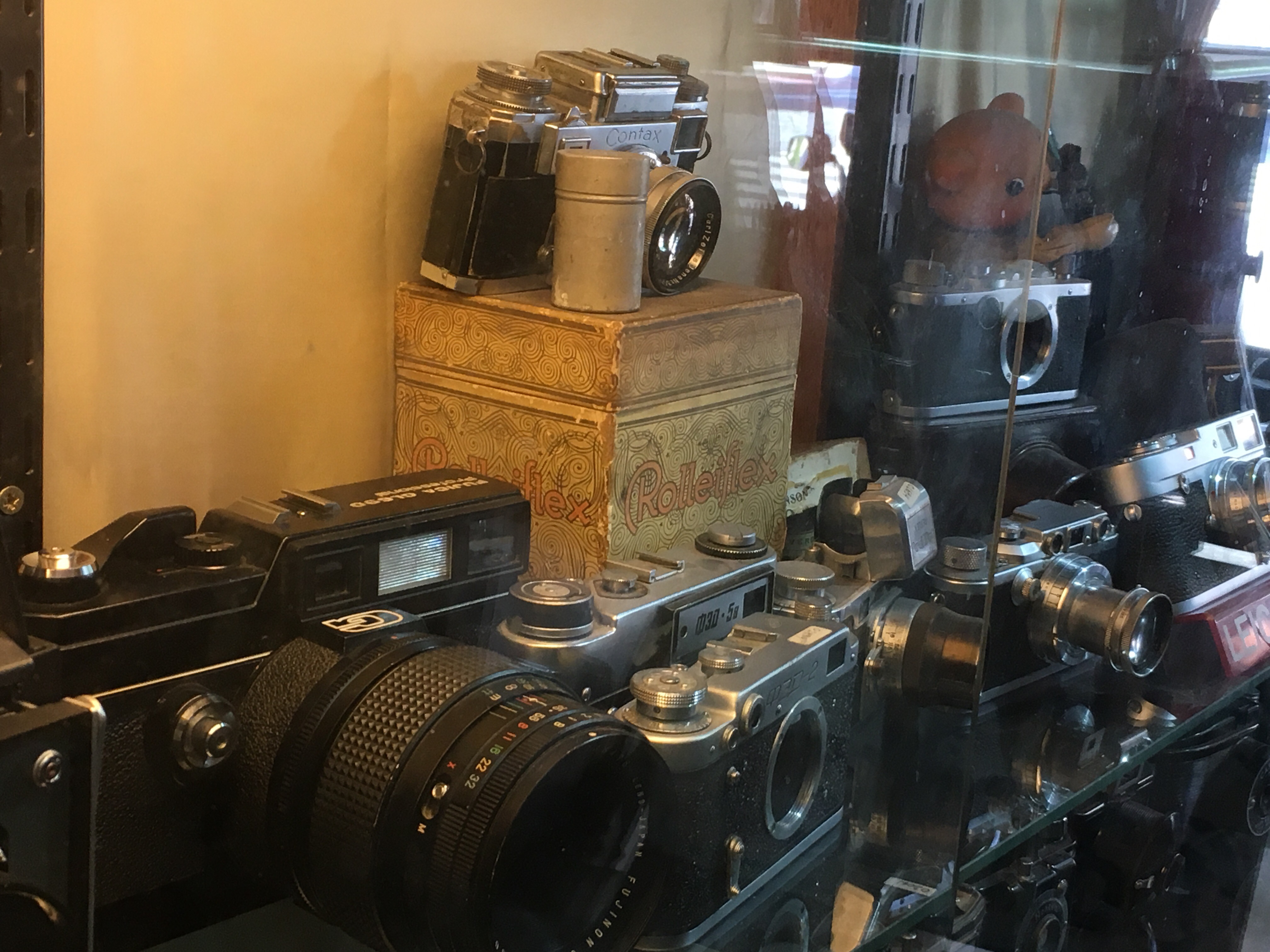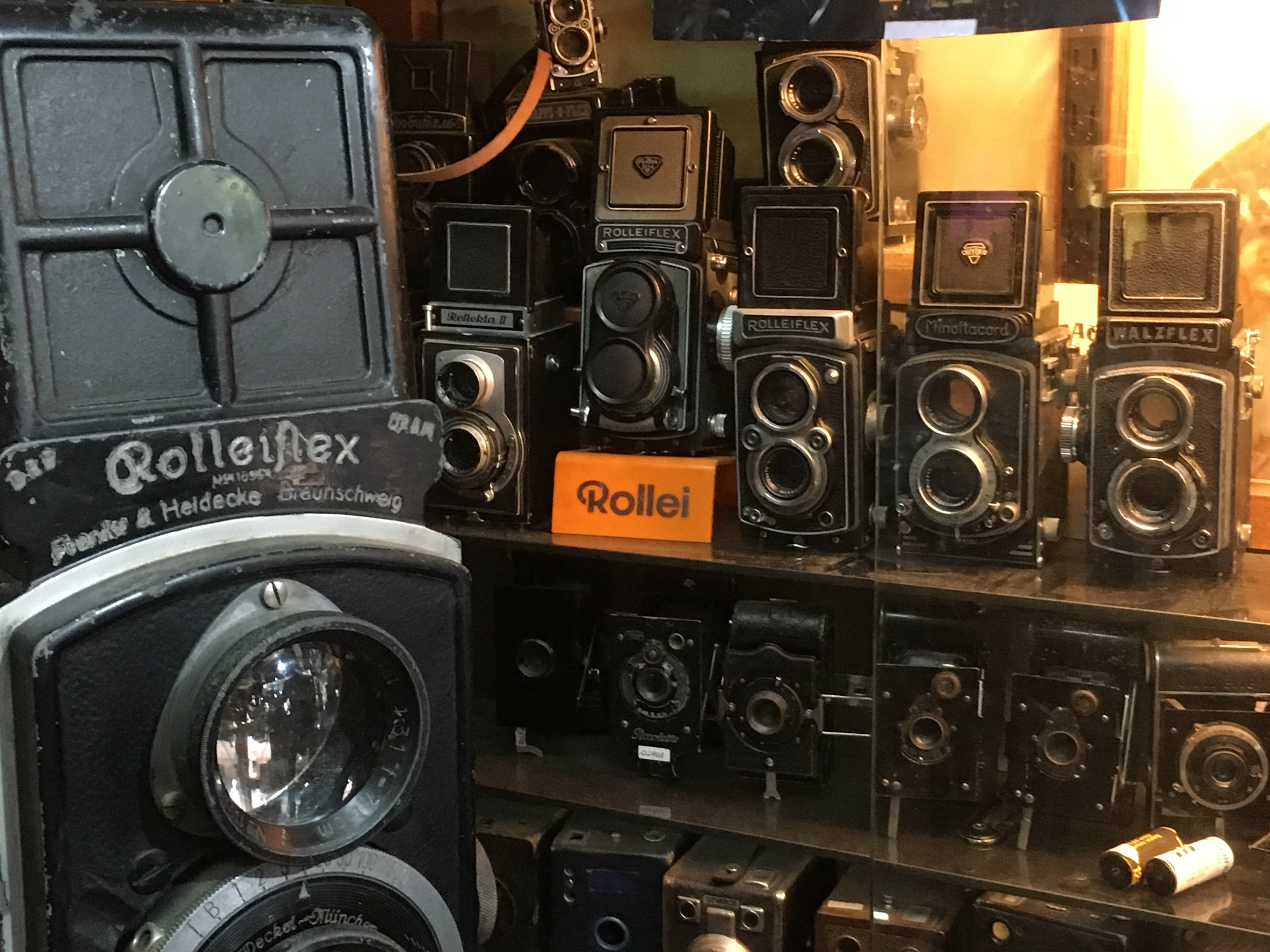 Essa Rollei grandona chama a atenção, o boneco do Chaplin também.