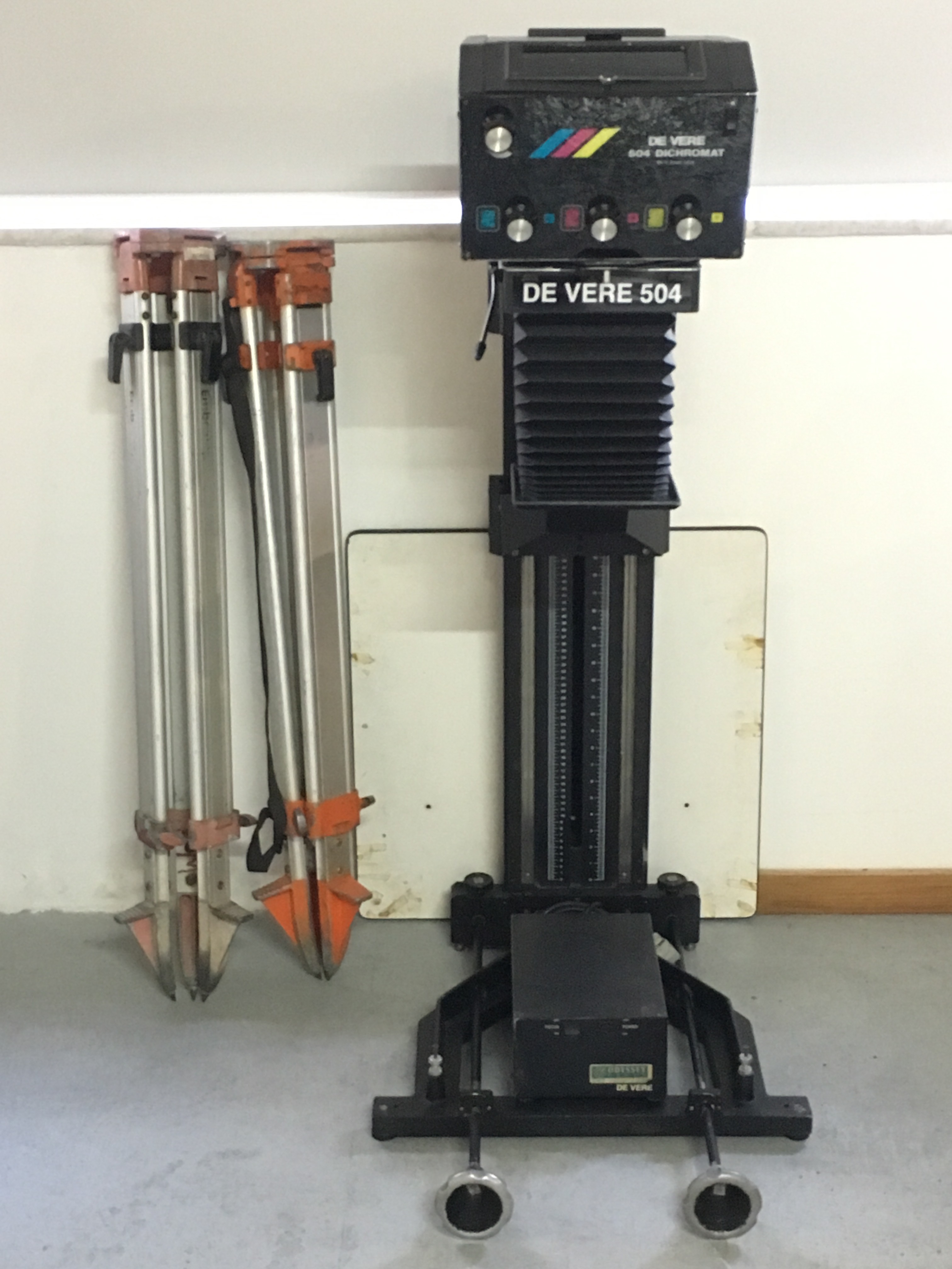 Esse De Vere 504 veio em pedaços, eram três e eu já contei essa história aqui. Um virou um novo ampliador 5×7″, um é apenas uma coluna guardada e esse é o que foi montado com as melhores peças dos três e está quase completo. Encostado aqui ele aguarda um projeto.