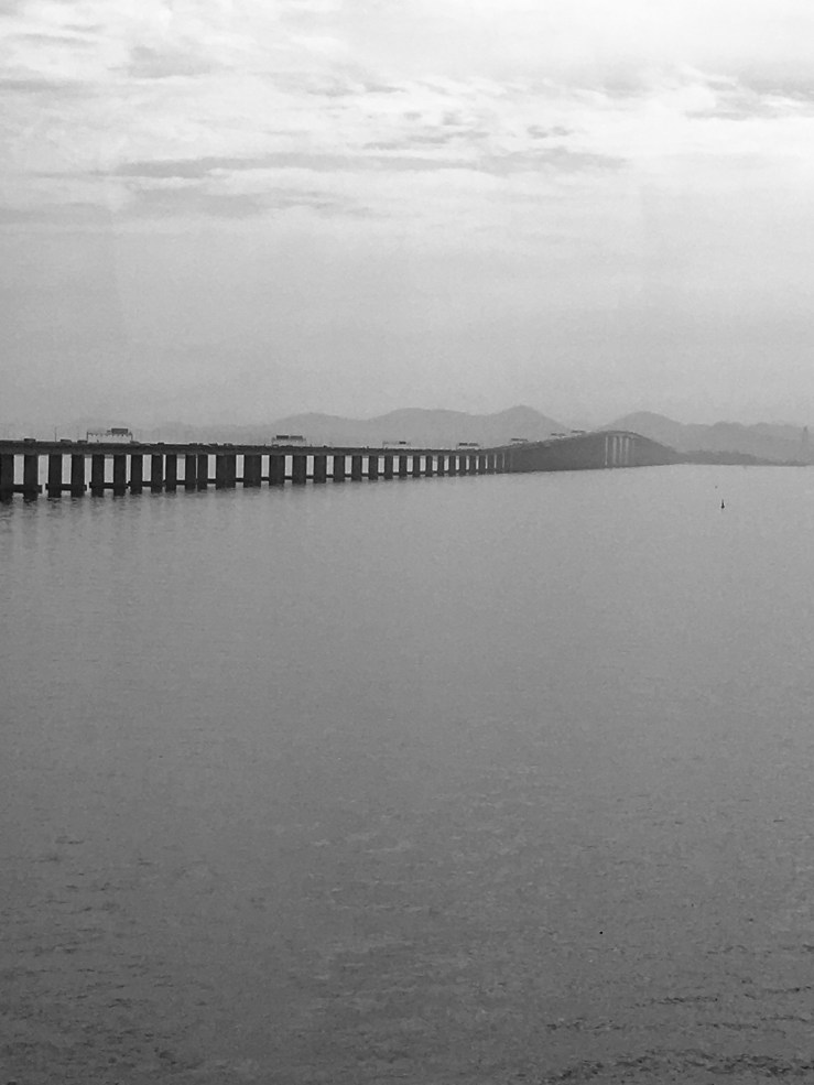 Hoje o ônibus saiu do Galeão pontualmente. Soldados com fuzis nas ruas. A ponte envolta em uma névoa nojenta. Trânsito livre. O ônibus colou na faixa da direita, o mar lá embaixo, vertigem.