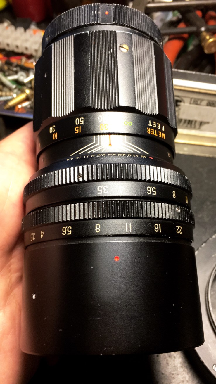 Essa objetiva Kawanon 180mm f/3.5 com sistema preset de diafragma chegou precisando de diversos cuidados, aparentemente ele foi desmontada para alguns reparos que não chegaram a ser executados. A primeira coisa que percebi é que ela era muito pesada na frente, uma característica frequente das objetivas com design sonnar e isso já me deixou empolgado.