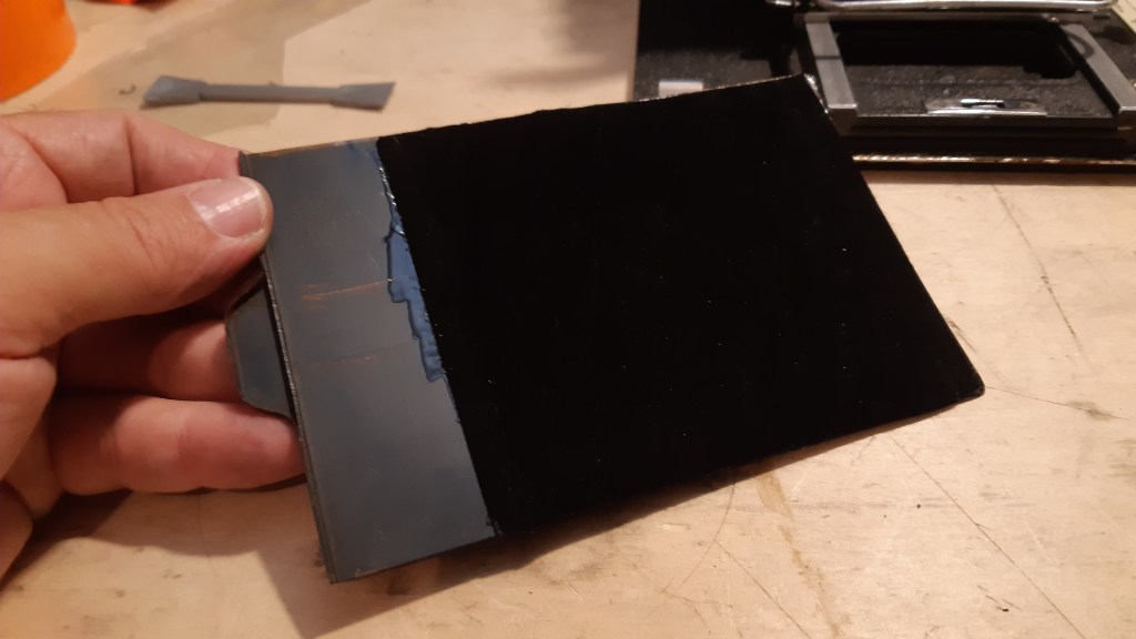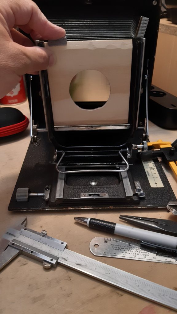 Depois que as placas estavam secas, comecei a ajustar as objetivas nelas. Acabei fazendo uma placa para uma objetiva Petzval também. E para essas objetivas sem obturador, improvisei um com um pedaço de veludo preto colado num darkslide 9x12cm.
