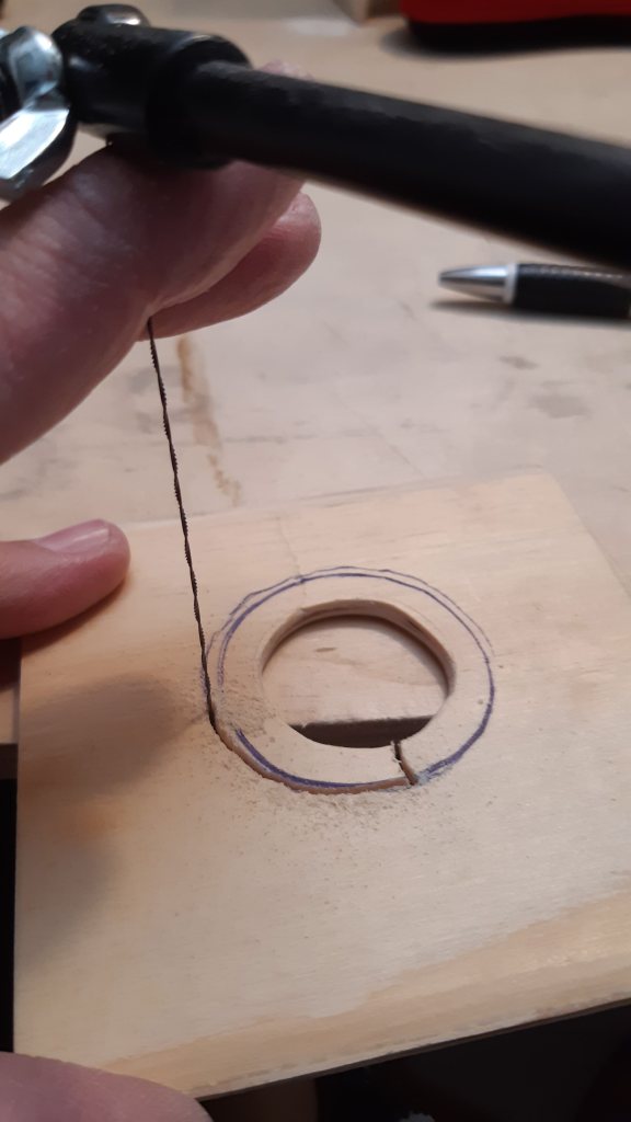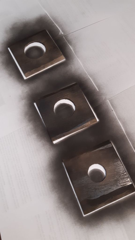 De uma tampa de caixa de vinho cortei alguns quadrados com 10,3cm de lado. Fiz chanfros na parte superior e inferior para encaixar na câmara e com uma serra de fio eu cortei os furos em algumas dessas placas.