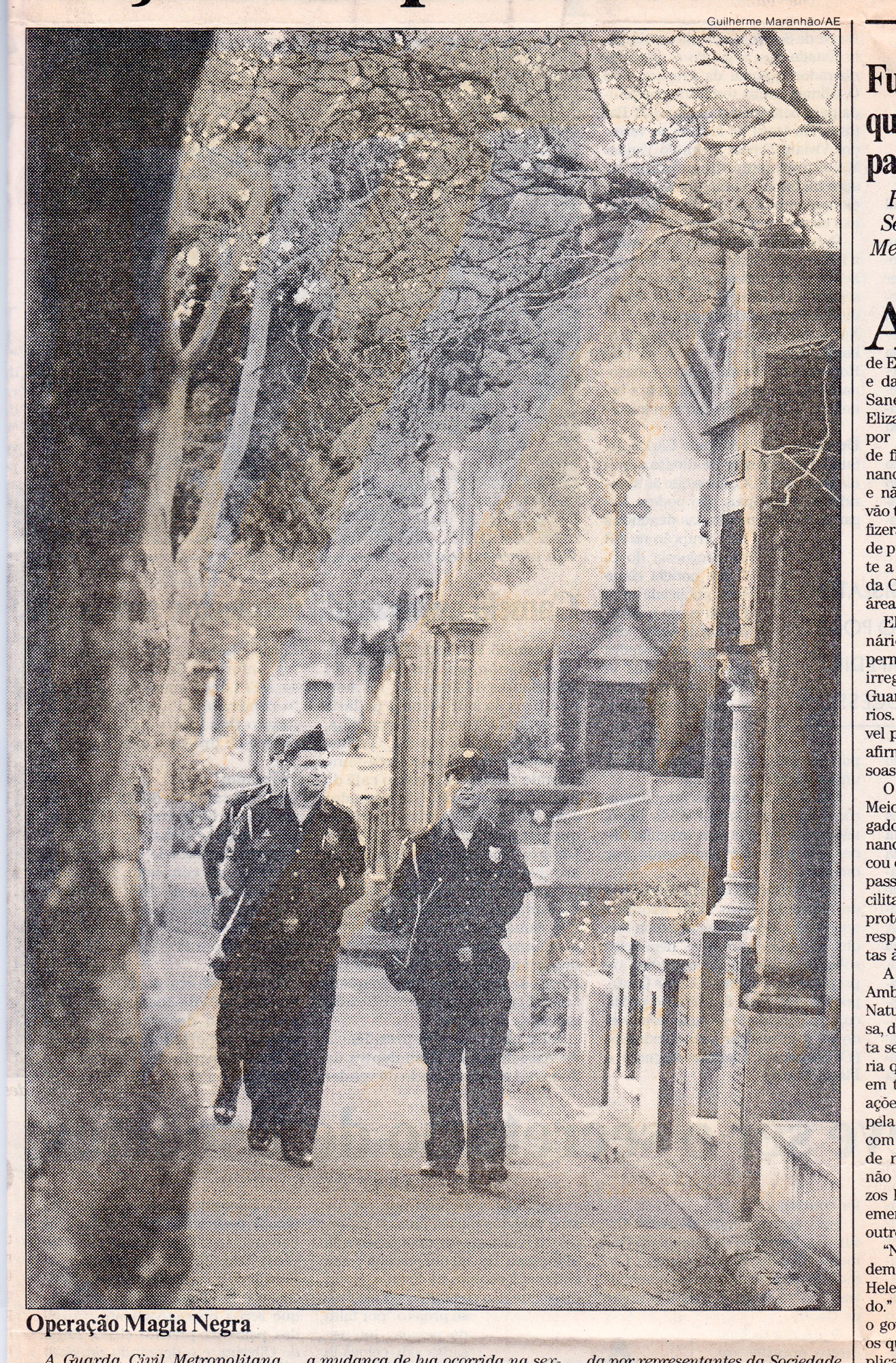 Entre 1995 e 1997 estive como freelancer para o jornal O Estado de São Paulo e para o Jornal da Tarde. Coisas do dia a dia da cidade, nada muito sério ou grave, ou seja features, no hard news. Operação Magia Negra diz a legenda da imagem, esse foi um dia interessante: circulei com uma patrulha da polícia pelos cemitérios da cidade a procura de pessoas praticando rituais religiosos não autorizados.