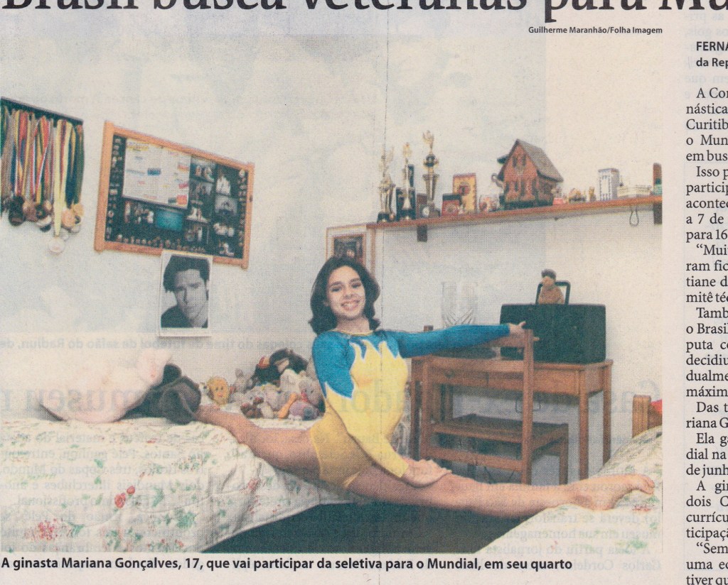Ainda em 1997 passei a trabalhar para o jornal A Folha de São Paulo. Tentei incorporar uma linguagem um pouco mais dinâmica, comecei a usar mais a 24mm e me aproximar de tudo. Também comecei a ver mais imagens impressas em cores. O ano era 1998 e tinha gente a descobrir a internet. E, aparentemente, eu já estava lá para fotografar (em filme). Acredito que usei a 24mm e virei a câmara na diagonal because all cool kids were doing it. E como não notar aquele Brad Pitt ali na parede da ginasta, ele ajuda a datar essa imagem.
