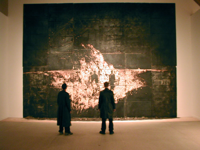 Esse figura encontrou um jeito de mudar a madeira, trabalhando no negativo, como se faz quando se cria uma matriz de xilogravura, mas com fogo. As chapas de compensado estavam chamuscadas enegrecidas, a raspagem desse enegrecido deixava transparecer a cor da madeira. E os dois garotos apareceram na hora certa, ou talvez eles ficassem lá o tempo todo e eu não tenha me ligado que eles faziam parte da obra, afinal era coincidência demais.