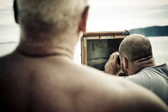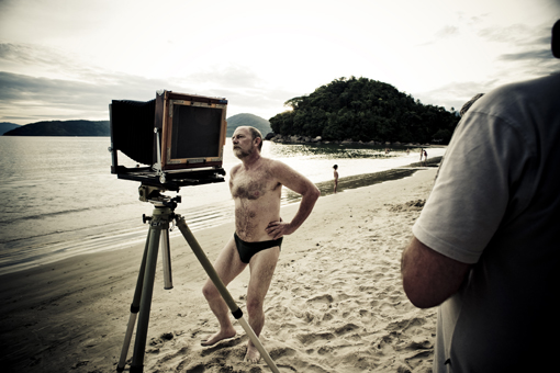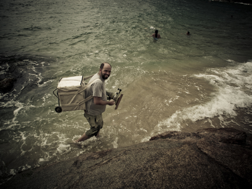 Andar com uma câmara 8×10″ por ai gera um tanto de curiosidade. As perguntas mais frequentes foram: de que ano é essa câmara? A resposta é 1920. A foto é para uma revista? A resposta é não. E num momento, enquanto eu levava a bolsa de lona sobre o carrinho chegaram a me perguntar quanto era o preço do kilo do camarão. É mole? Mais três fotos do Fernando dos curiosos de Ubatuba.