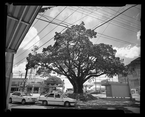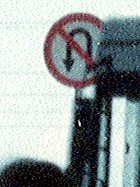 Coloquei um negativo 4×5″ dentro do scanner e pedi um scan. Selecionei uma área de 1x1mm aproximadamente dentro da imagem (atrás do taxi da direita há uma pessoa de pé, atrás dele passa um ônibus pela rua de trás, atrás dele há uma placa de trânsito). Pedi um scan a 8000 dpi, só para ver.