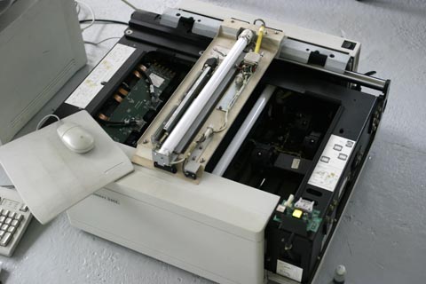 Na volta do almoço peguei uma lanterna e comecei a olhar dentro do scanner, para tentar entender onde estava o mecanismo de foco. Podia parecer simples, mas não era, esse scanner é dotado de 7 lentes ao todo, e eu não sabia quais eram fixas e quais se moviam para focar. Procurei, desmontei mais um pouco, fucei aqui e ali. Ainda meio cético, constatei que apenas uma das lentes realmente tinha um motor que a fazia focar, as outras todas elas fixas, calibradas na fábrica.