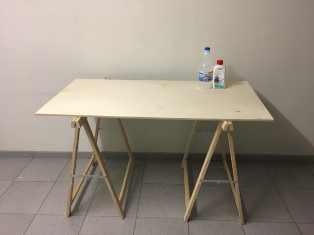 Outros itens foram mais fáceis, as dicas da Sofia Silva valeram e achei água destilada e glicerina no Leroy Merlin, de onde vieram também os cavaletes, a placa que virou tampo de mesa e a estante metálica.