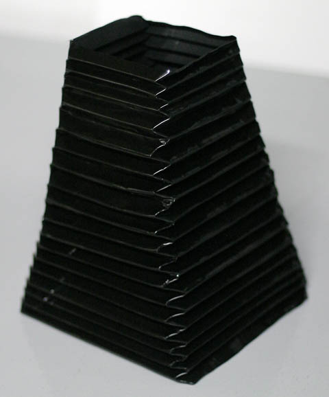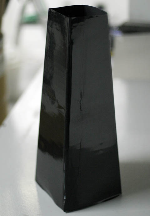 Só uma última consideração sobre os materiais do fole: a idéia de usar o plástico preto da embalagem de papel fotográfico (Daniel Mitchell) foi ótima. Eu tinha dois sacos pretos de papel tamanho 50x60cm, um mais fininho, um mais grosso, usei o mais grosso (de um papel Ilford importado). Além disso usei um papel Colorplus preto pesado como estrutura do fole (tamanho A2, adquirido na Papelaria Universitária, R$5,60) e mais o tecido (forro 55% poliéster 45% algodão, R$7,20 por 1 metro que rendeu dois foles).