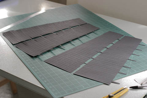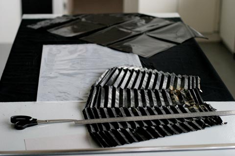 Ficaram assim as estruturas de papel novas. Depois disso, ainda usando a cola 77 da 3M colei isso ao tecido preto.