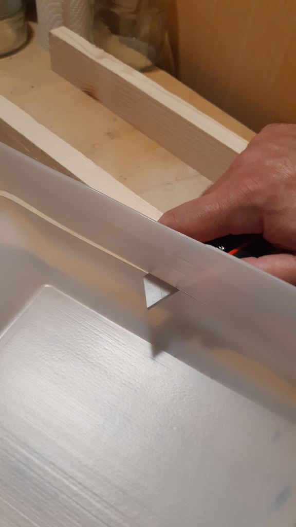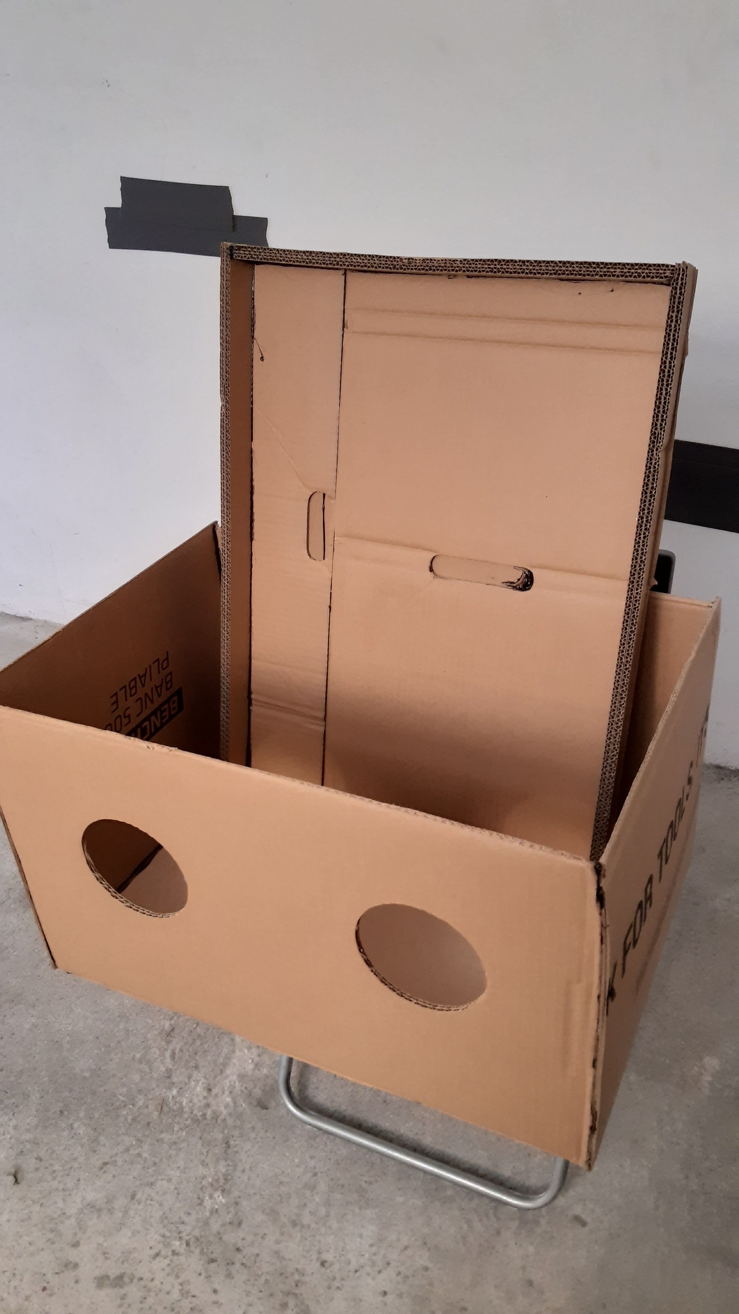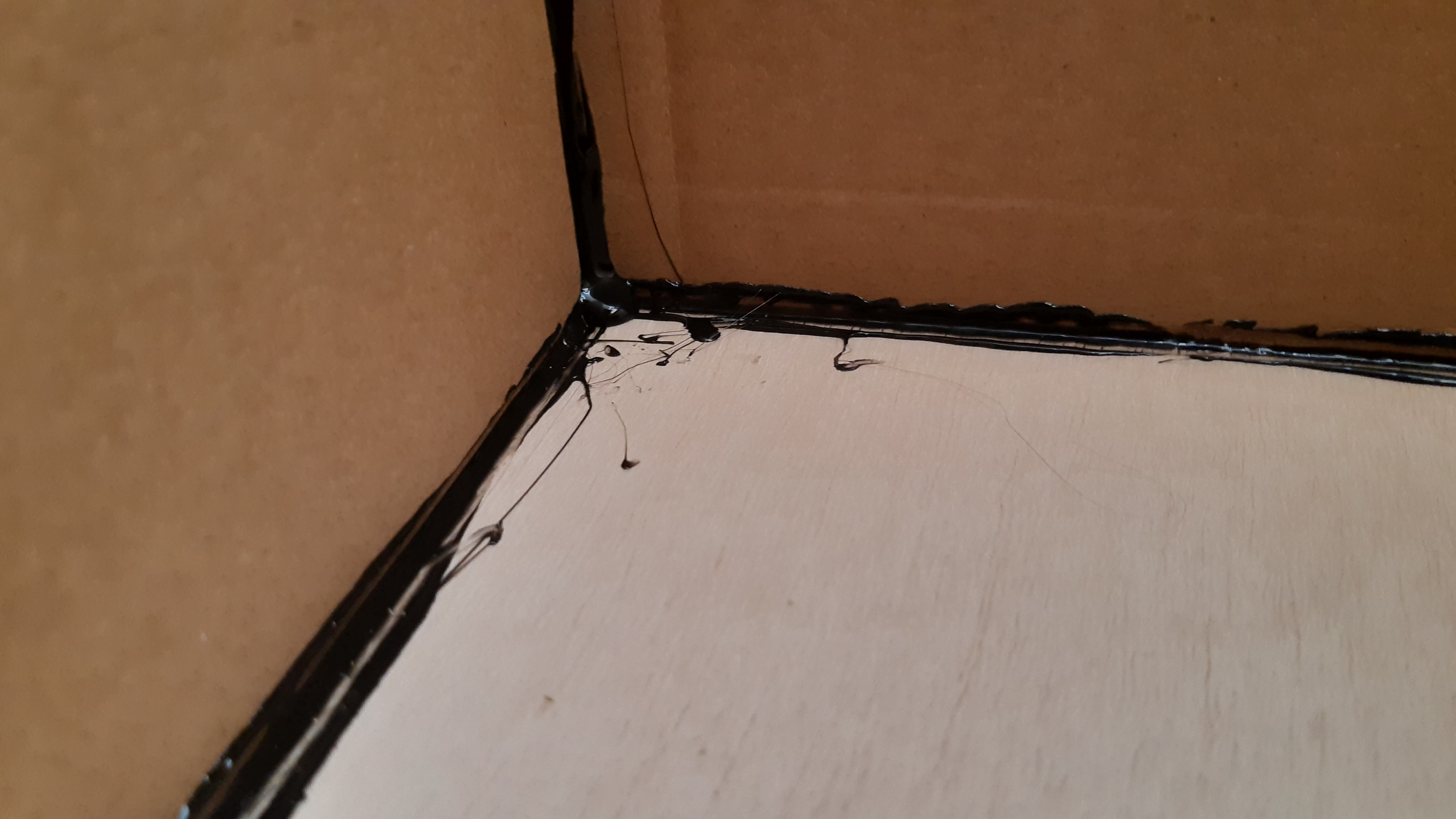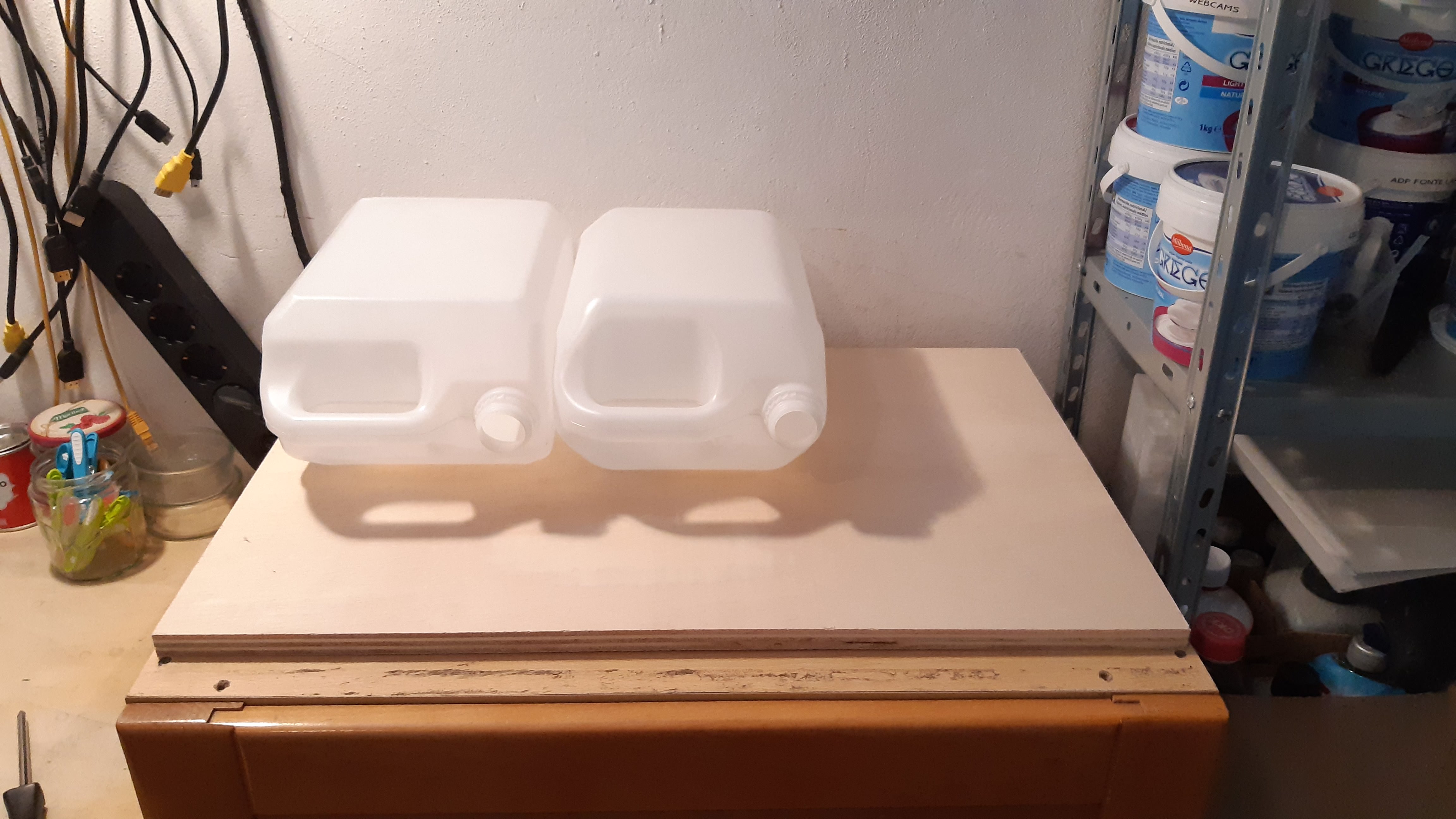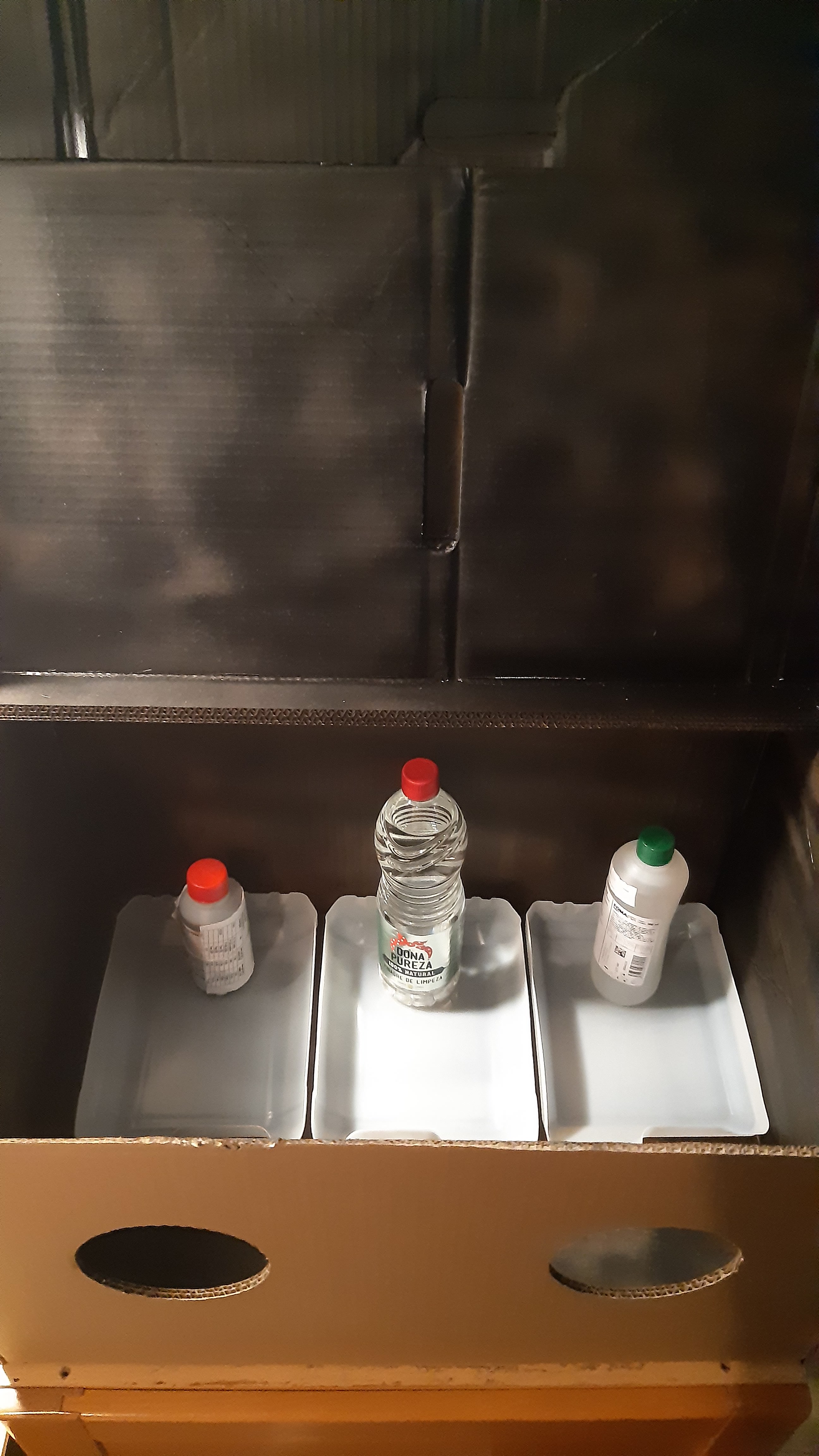Tinha um pedaço de compensado que imaginei como base da caixa. Achei duas garrafas grandes de detergente que poderiam ser convertidas em bandejas de revelação (tinas em PT-PT). O papelão veio do lixo reciclável, como as garrafas. A opção seria usar gatorfoam/k-line, mas sairia caro e não sei quanto tempo a umidade da garagem levará para deixar a caixa inutilizável. Bandejas de 13x18cm da marca AP custam entre 3,5 e 5 euros novas, talvez seja um investimento necessário se os filmes começarem a grudar no fundo dessas bandejas improvisadas.