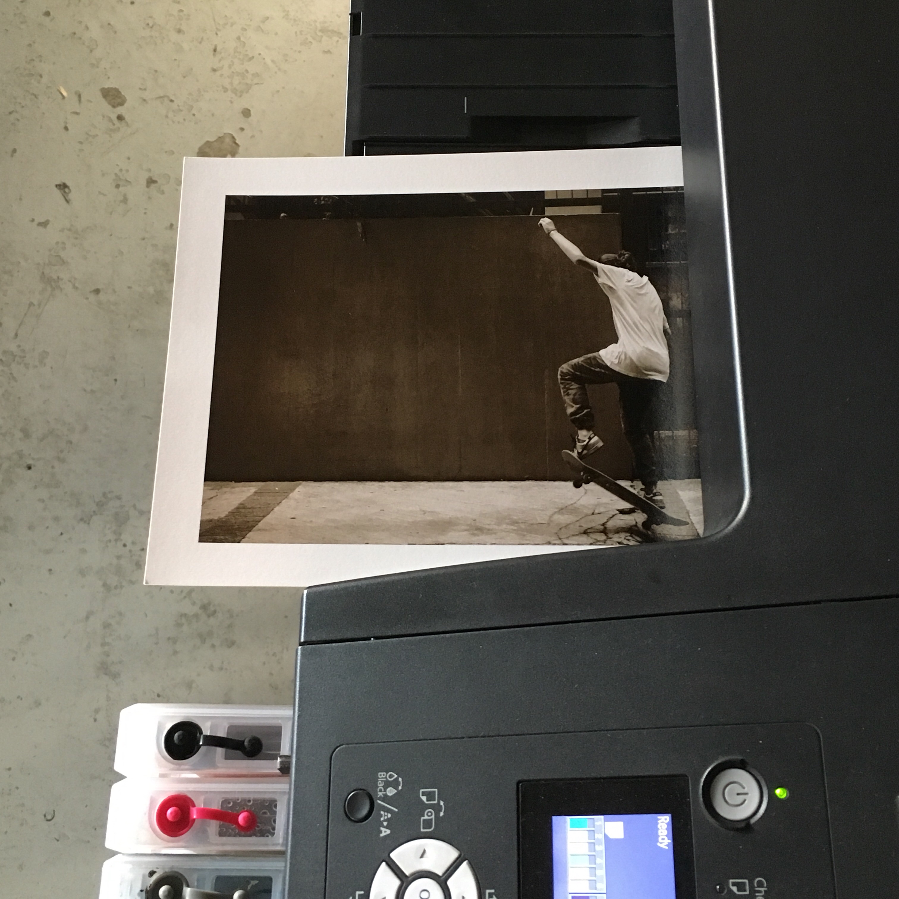 Parecia um pequeno sucesso, a impressora até teve outra inicialização longa e puxou bastante tinta para suas mangueiras de todos os tanques. Depois de imprimir algumas cópias, percebi que um dos tanques estava quase vazio. Eu tinha perfurado o tanque com a agulha da seringa por um descuido. Algo como uns 60ml de tinta escorreram para dentro da impressora e sumiram, provavelmente aquela área é canalizada para o tanque de manutenção. Foi um susto, mas não foi nada muito grave, o trajeto do papel permanecia limpo. Fiz algumas mudanças de chips entre tanques e devolvi um dos cartuchos originais da impressora, assim pude retirar o tanque perfurado e depois continuar a imprimir.