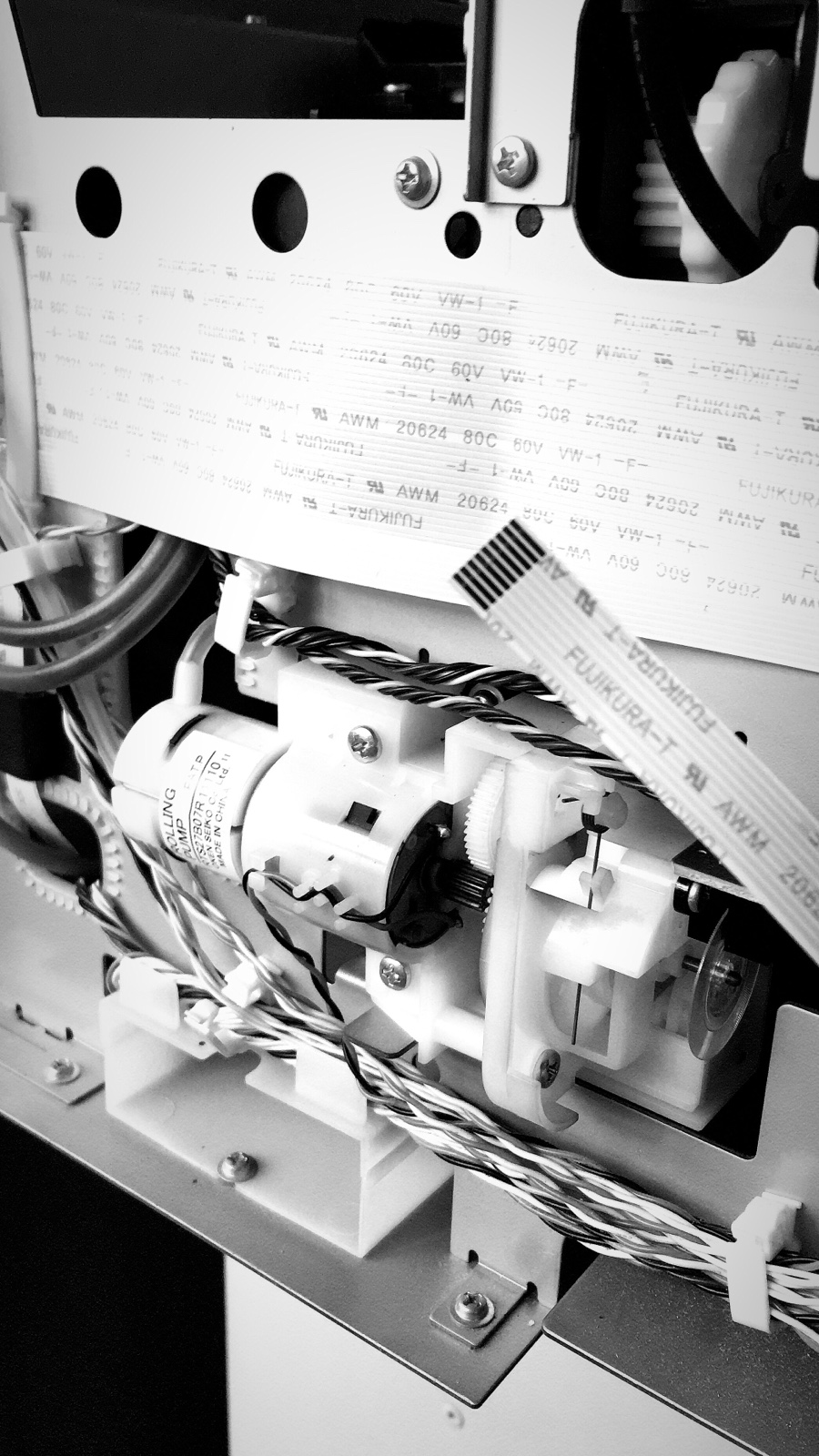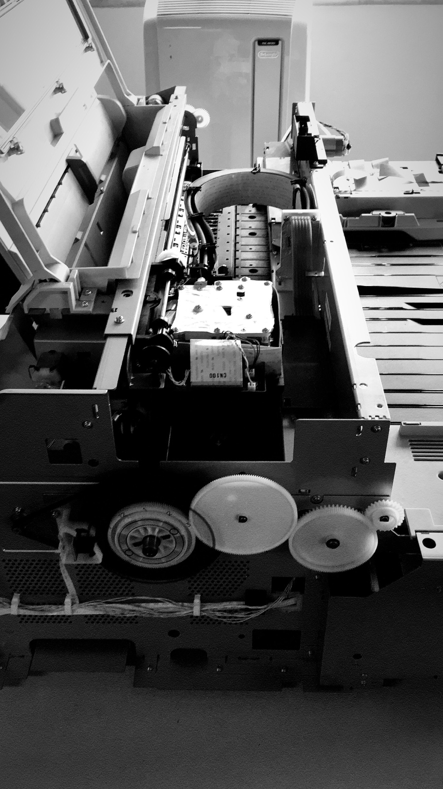 Além da cópia estar úmida, ela tinha também muitas marcas transversais deixadas pela passagem da cabeça de impressão. A cabeça estava passando muito próxima ao papel e deixando riscos de tinta.
