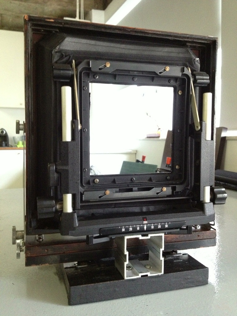 Na verdade a câmera estava coberta de fórmica preta e tinha cantoneiras de alumínio, queriam esconder a idade dela, mas estava mal feito e comprometia o funcionamento das coisas. Tinha um back deslizante para fazer retratos e um obturador Packard entuchado dentro do fole que não estava legal. Passei o resto do fim-de-semana tirando esses excesso e tentando entender quais eram os problemas.