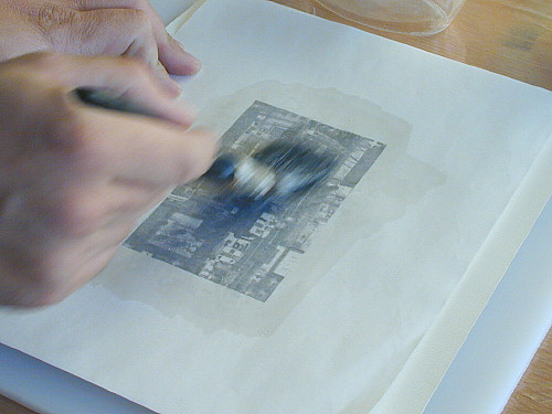 Simples? Demais! Fui a uma loja de material de construção aqui e comprei o que é chamado de “thinner para vernizes”, não tenho certeza de como isso é chamado ai no Brasil, mas acho que qualquer coisa que sirva de solvente para verniz Sparlack tem que servir! Cheguei em casa, cortei um pedaço de papel de aquarela, apoiei numa placa de polietileno (que não derrete com qualquer coisa), pus a cópia xerox de cara para o papel de aquarela, esfreguei um pouco do solvente com um pincel nas costas da cópia, e depois esfreguei as costas de uma colher na região da imagem para fazer pressão… Quando eu levantei a cópia xerox ela ainda estava quase tão escura quanto antes, mas no papel de aquarela estava lá a imagem meio borrada, meio confusa, típica de um processo de transfer.