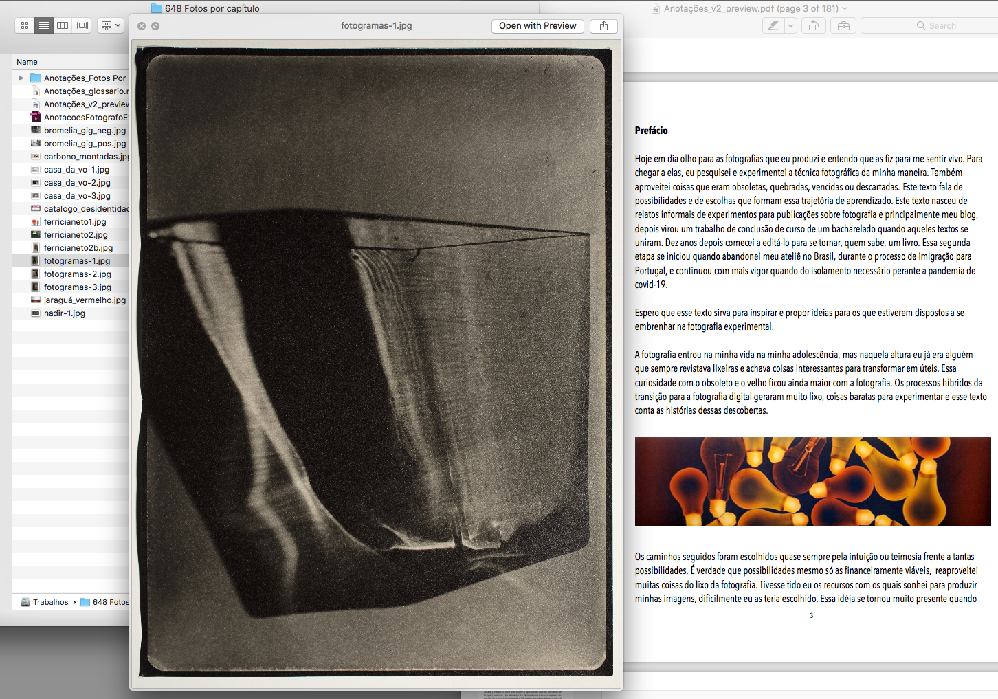 O texto é um encadeamento de anotações, artigos, relatos e pensamentos sobre esses processos experimentais que uso na fotografia. Junta textos desde os anos 90, como os escritos para o portal FotoPro e também coisas que escrevi em inglês, mas que nesse volume estarão em português.