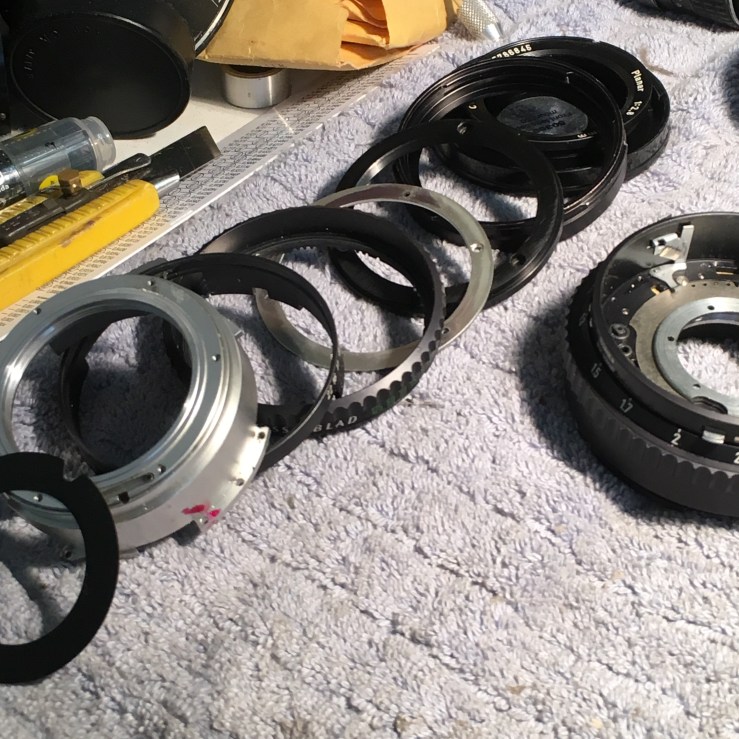 • Tentando solucionar um fole para uma Toyo 4×5″ (o fole original chegou com muitas regiões de descolamento e transparência). Tentei usar tinta de serigrafia para preencher a trama do tecido interno do fole, no locais onde a película externa havia sido arrancada. A tinta preta de silkscreen (sintética) pegou bem tanto no tecido como no couro falso, mas mesmo após uma semana ainda não secou completamente e deixou o fole grudento. Fui à região do Gasômetro e comprei dois tipos de nylon de bolsa/mochila pensando em fazer um fole balão para substituir esse (que é normal).
