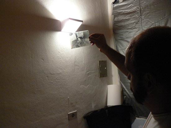 O revelador era o único que eu havia levado na viagem, o Selectol, um revelador de baixo contraste para papéis, com muito brometo, o que ajuda a segurar o véu de base dos materiais fotossensíveis. Isso com certeza foi um fator que ajudou a evitar um desastre de velatura. Passei as chapas para o interruptor e depois fixei. A luminária da cozinha parecia uma mesa de luz pequena, dessas do tamanho da própria chapa 4×5″, inclinada, aparafusada na parede. Levantei uma chapa que estava já no fixador, acendi a luz e o inimaginável havia acontecido, as chapas tinham menos véu de base do que com a revelação em laboratório sem improviso. O Selectol e a exposição forte (ISO 50) haviam vencido a luz que invadia a cozinha. O Luish fotografou esse momento.